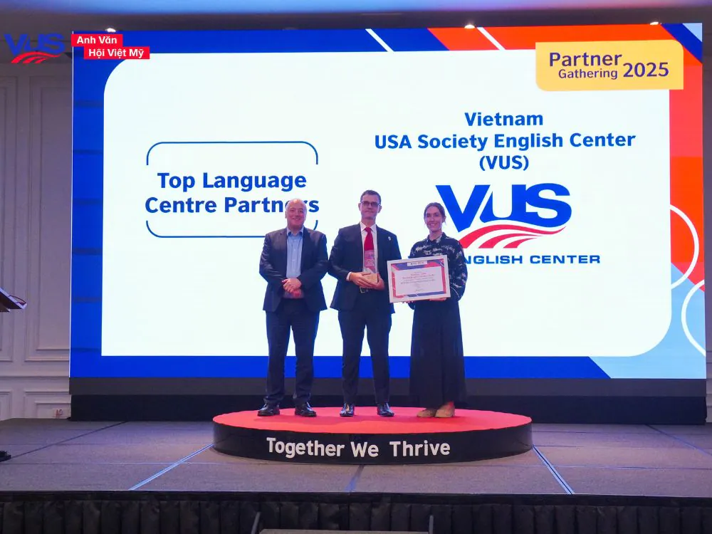 Ngày 13/11/2025, hệ thống Anh ngữ VUS được vinh danh là IELTS Top Language Centre Partner 2025 tại sự kiện IELTS Partner Gathering 2025, đây là sự kiện gặp gỡ đối tác thường niên của British Council (Hội đồng Anh) tổ chức với chủ đề “Together We Thrive.”