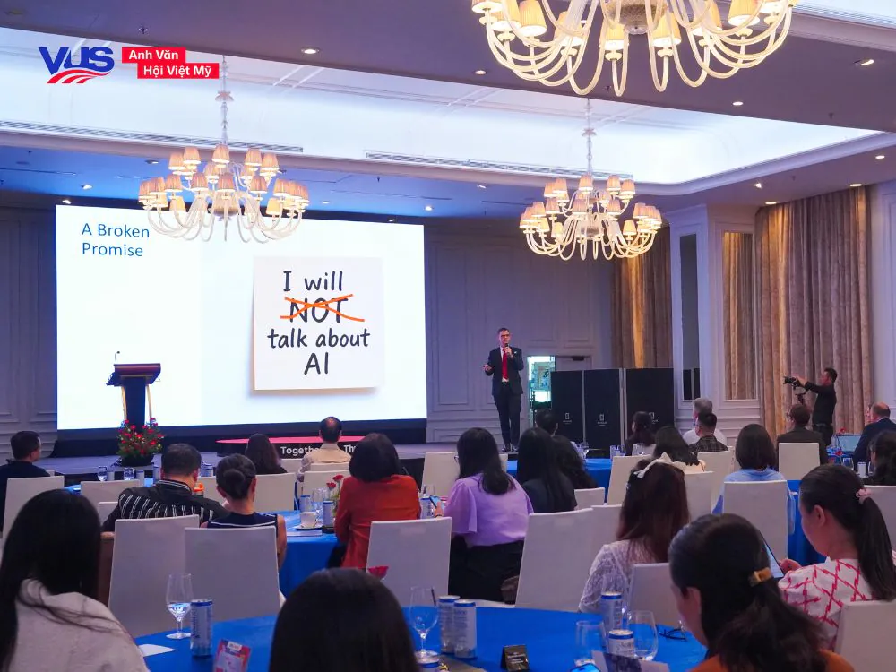 Đại diện VUS, ông Steven Happel - Quản lý Chuyên môn Cấp cao đã có phần trình bày chuyên sâu về ứng dụng của AI trong hỗ trợ giảng dạy và học tập tiếng Anh, đặc biệt trong hành trình luyện thi IELTS. Ông chia sẻ về cách VUS đang triển khai công nghệ AI nhằm giúp học viên chủ động hơn, học hiệu quả hơn và chinh phục band điểm mơ ước thông qua nền tảng OVI IELTS – sản phẩm EdTech độc quyền do VUS phát triển.
